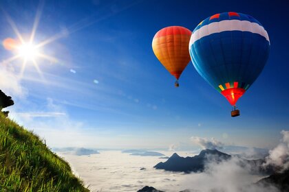 Luftballons schweben über den bergen vor dem hintergrund eines klaren blauen himmelsLuftballons schweben über den Bergen vor dem Hintergrund eines klaren blauen Himmels