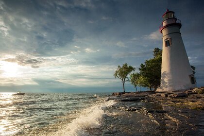 Ein Leuchtturm am Meer. Flut