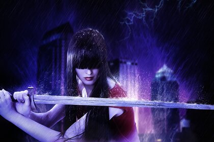 Ein erstaunliches mädchen, das ein schwert auf einem schönen hintergrund hältEin erstaunliches Mädchen, das ein Schwert auf einem schönen Hintergrund hält