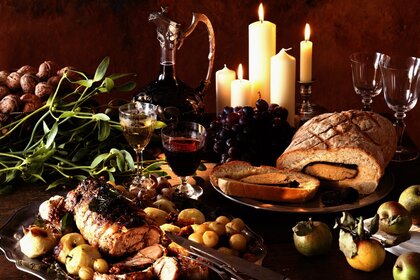 Stillleben Kerzen mit Essen und Nüssen