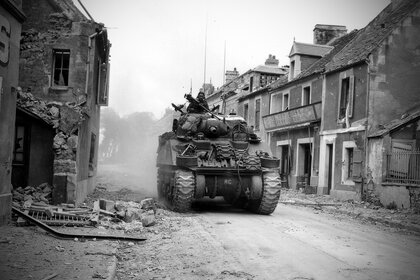 Ein Militärpanzer auf einer zerstörten Stadtstraße