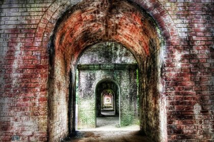 Durchgehender gewölbter bogen eines alten hauses aus rotem backsteinDurchgehender gewölbter Bogen eines alten Hauses aus rotem Backstein