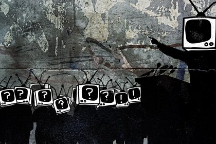 Graffiti an einer grauen betonwand, die menschen mit fernsehgeräten anstelle von köpfen darstelltGraffiti an einer grauen Betonwand, die Menschen mit Fernsehgeräten anstelle von Köpfen darstellt