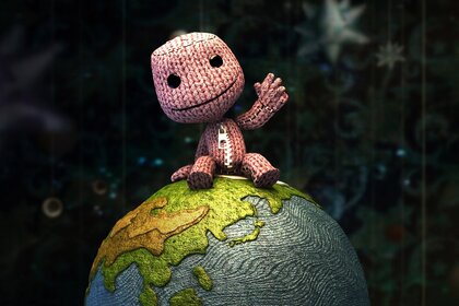 Ein gestrickter Mann sitzt auf dem Globus