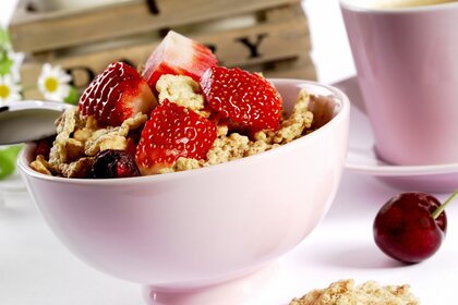 Leckere Flocken mit Milch und Erdbeeren