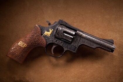 Pistole mit goldenem Hirsch auf braunem Hintergrund