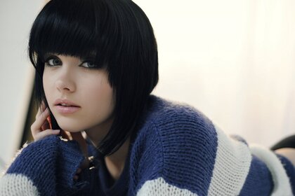 Langhaarige Brünette schaut ausdrucksstark in die Kamera