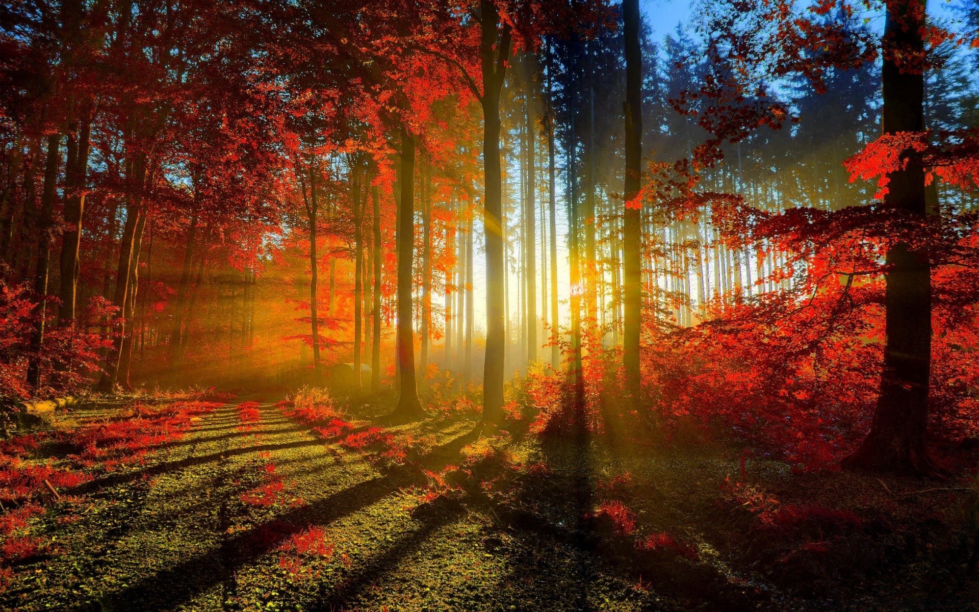 Bäume mit roten blättern und die strahlen der herbstsonne, die durch den nebel wehen