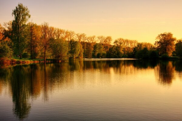 Schöne herbst traurige landschaft: bäume, wasseroberfläche, gras