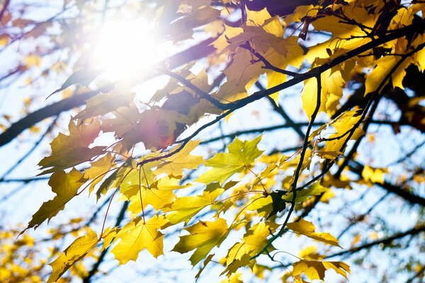 Die sonnenstrahlen brechen durch die äste von bäumen mit herbstlaub