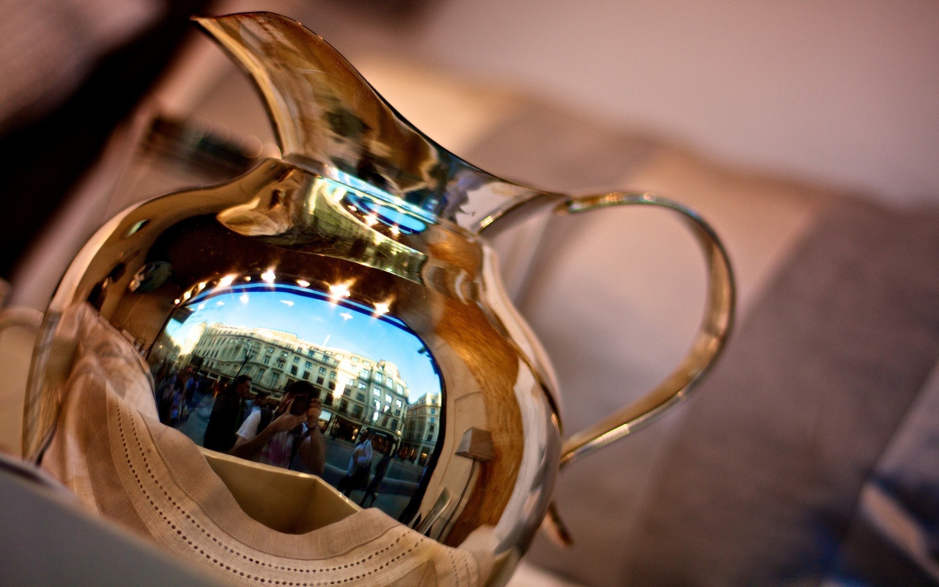 Goldener Krug mit Reflexion auf Hintergrund - wallpaper für das Telefon