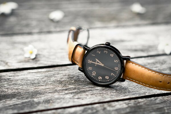 Uhr auf einer bank mit blumen