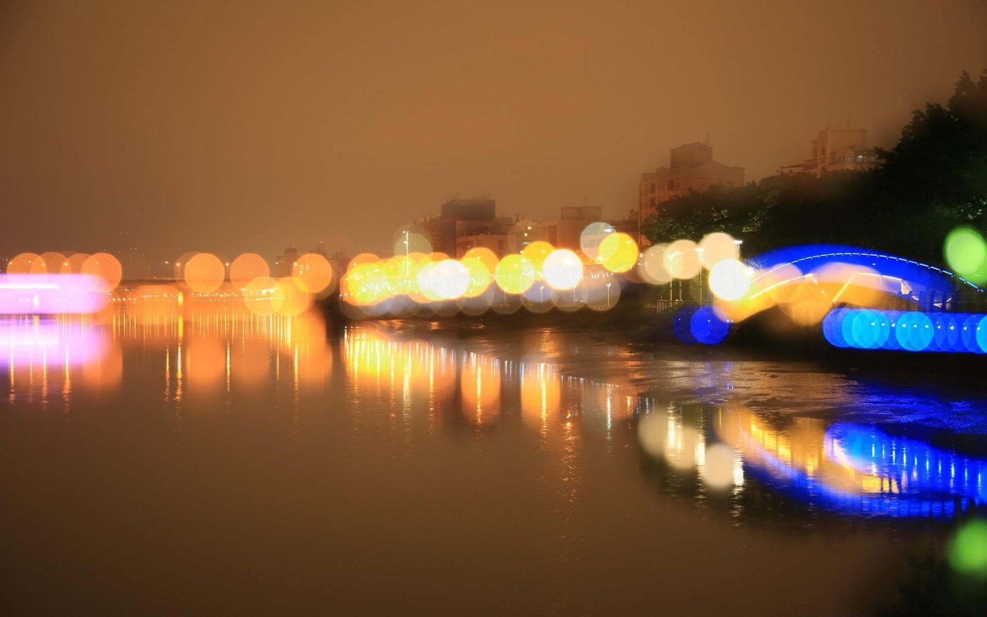 Verschwommene Blendung von bunten Lichtern am Wasser - wallpaper für das Telefon