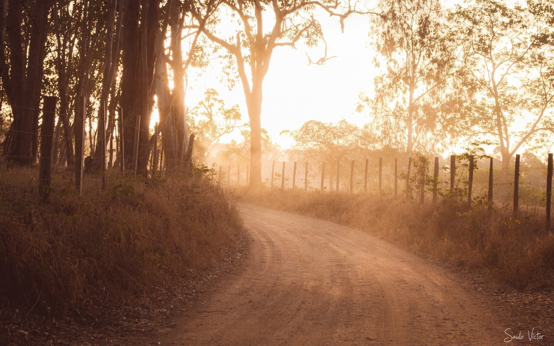 Eine neblige Landstraße. Milde Sonne. Staubige Straße - desktop-Hintergrund