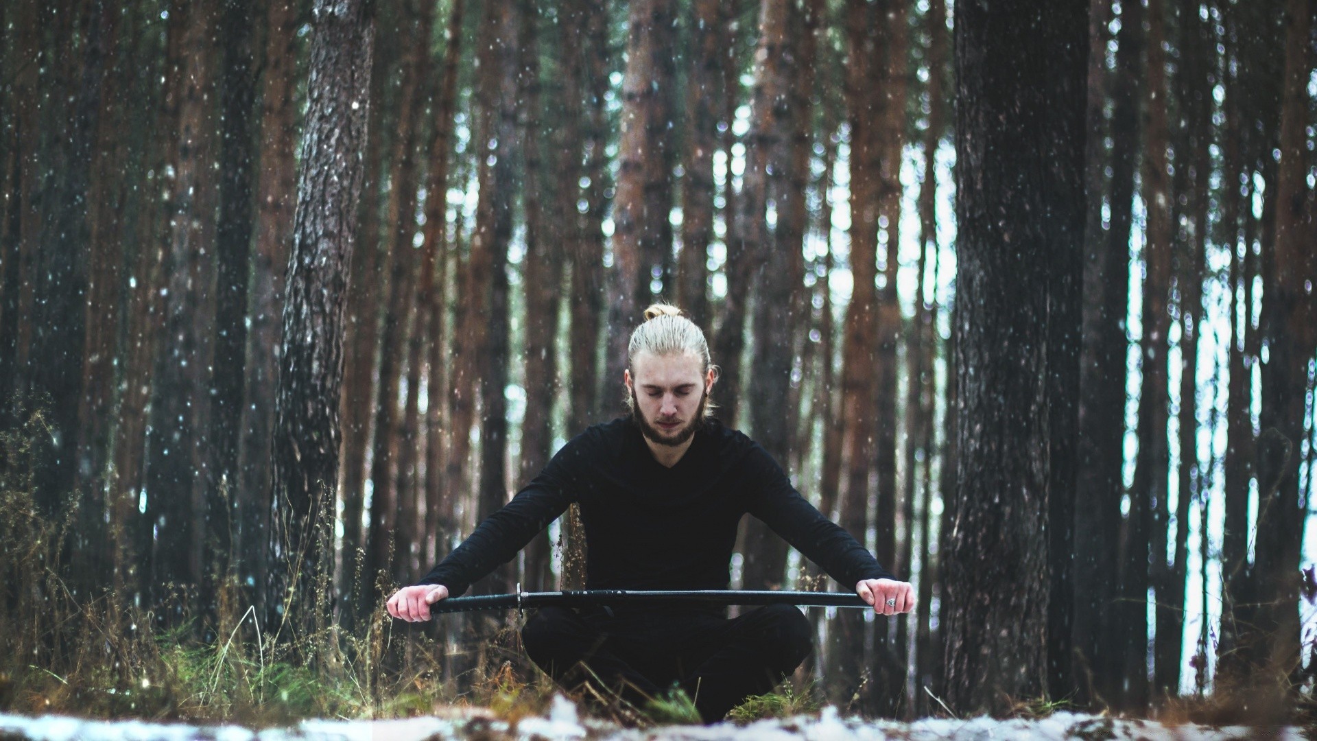 Mann mit Schwert auf Baumstämmen Hintergrund - desktop-Hintergrund