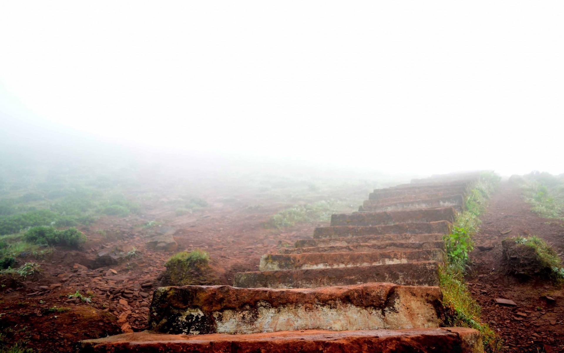 Eine Steintreppe steigt im Nebel auf - wallpaper für das Telefon