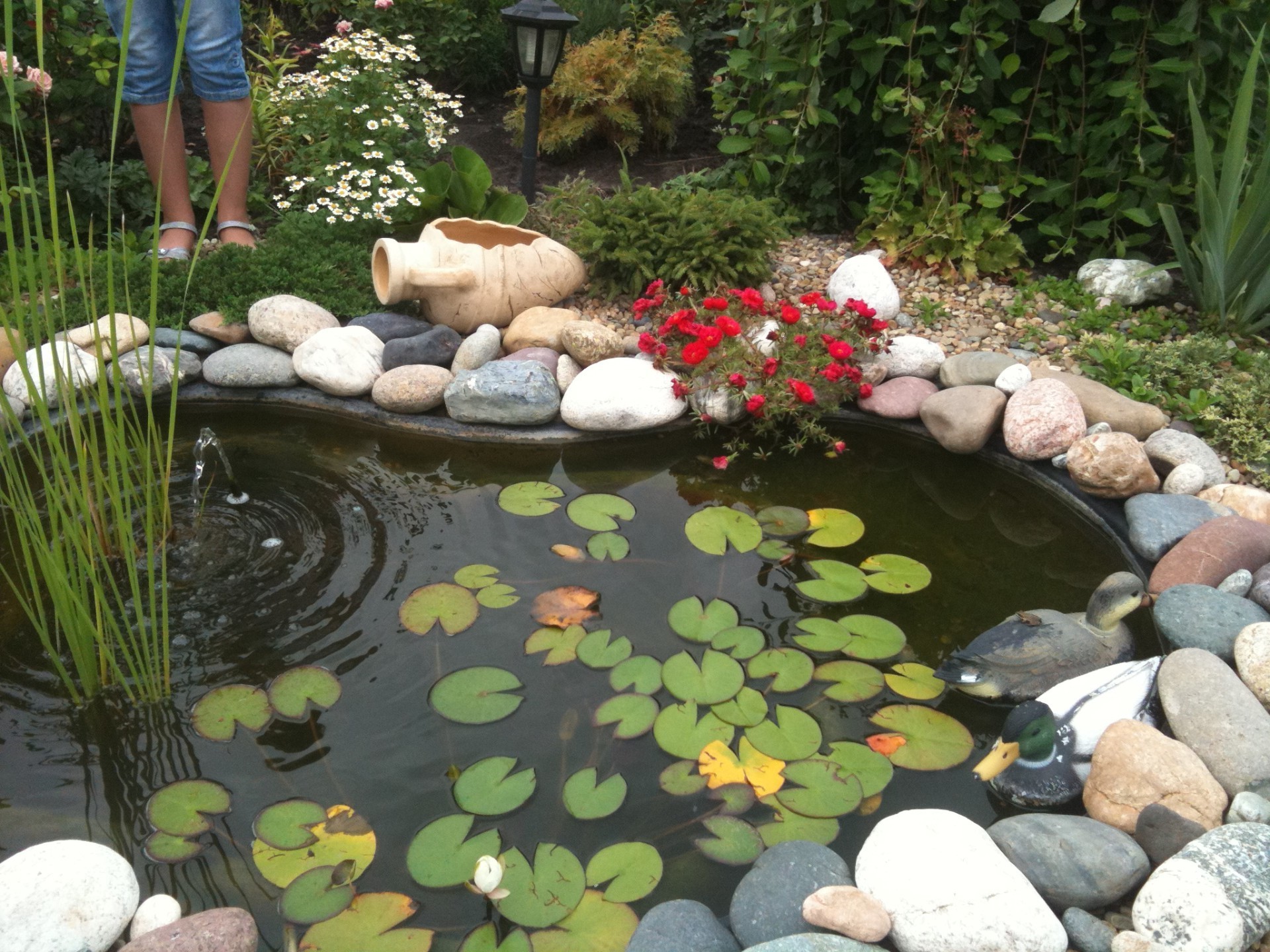 Künstlicher Teich mit Seerosen und Enten - wallpaper für das Telefon