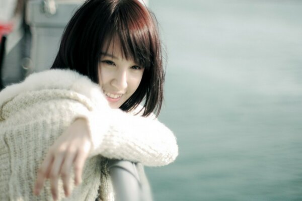 Porträt eines Mädchens im Pullover am Meer