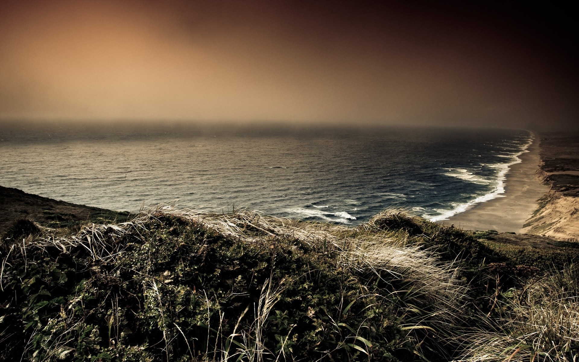 Ein grasbewachsener rand vor einer sandigen klippe und ein grenzenloses, düsteres meerEin grasbewachsener Rand vor einer sandigen Klippe und ein grenzenloses, düsteres Meer