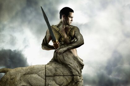 Ein Militärsoldat in Form einer Statue mit einer Waffe in der Hand