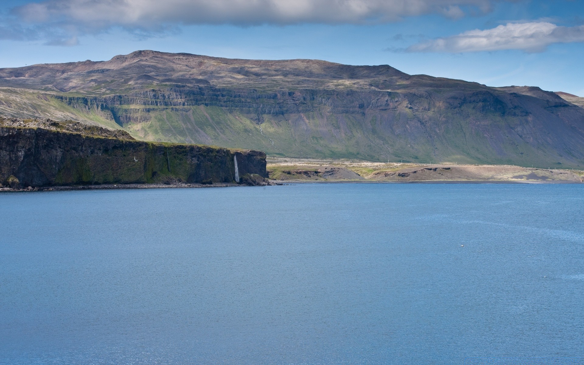Berge vor dem Hintergrund des Flusses und des blauen Himmels