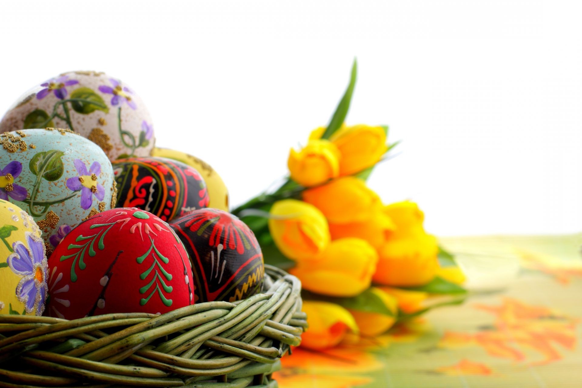 Osterset: Korb mit Eiern und Blumen