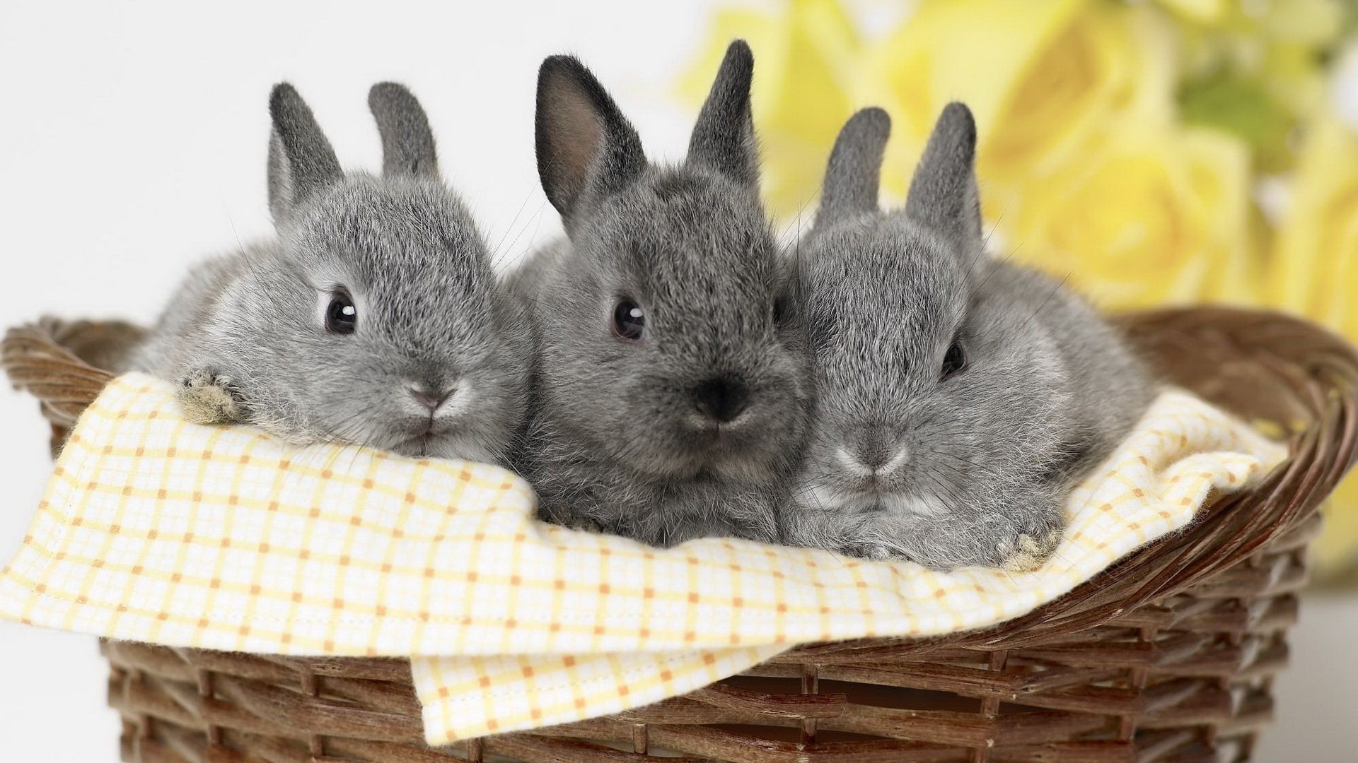 Flauschige Freunde im Korb. Kaninchen Freunde