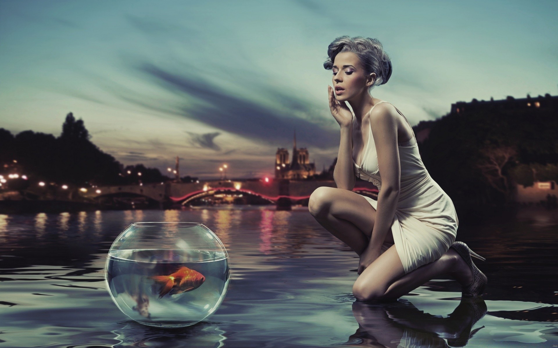 Mädchen mit einem Aquarium auf dem Hintergrund einer schönen Landschaft