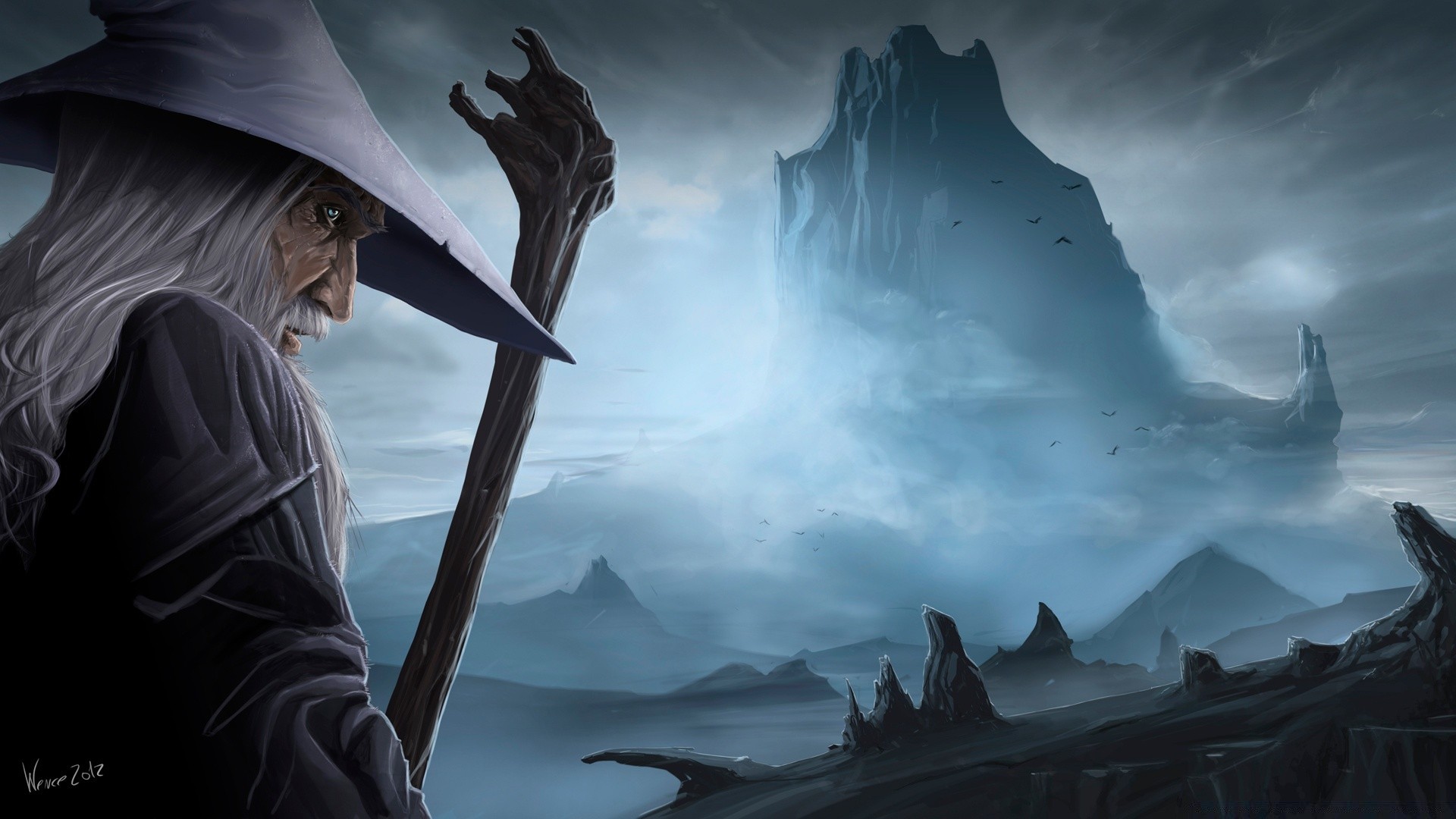 Alter mann mit bart und stab vor dem hintergrund der berge im nebelAlter Mann mit Bart und Stab vor dem Hintergrund der Berge im Nebel
