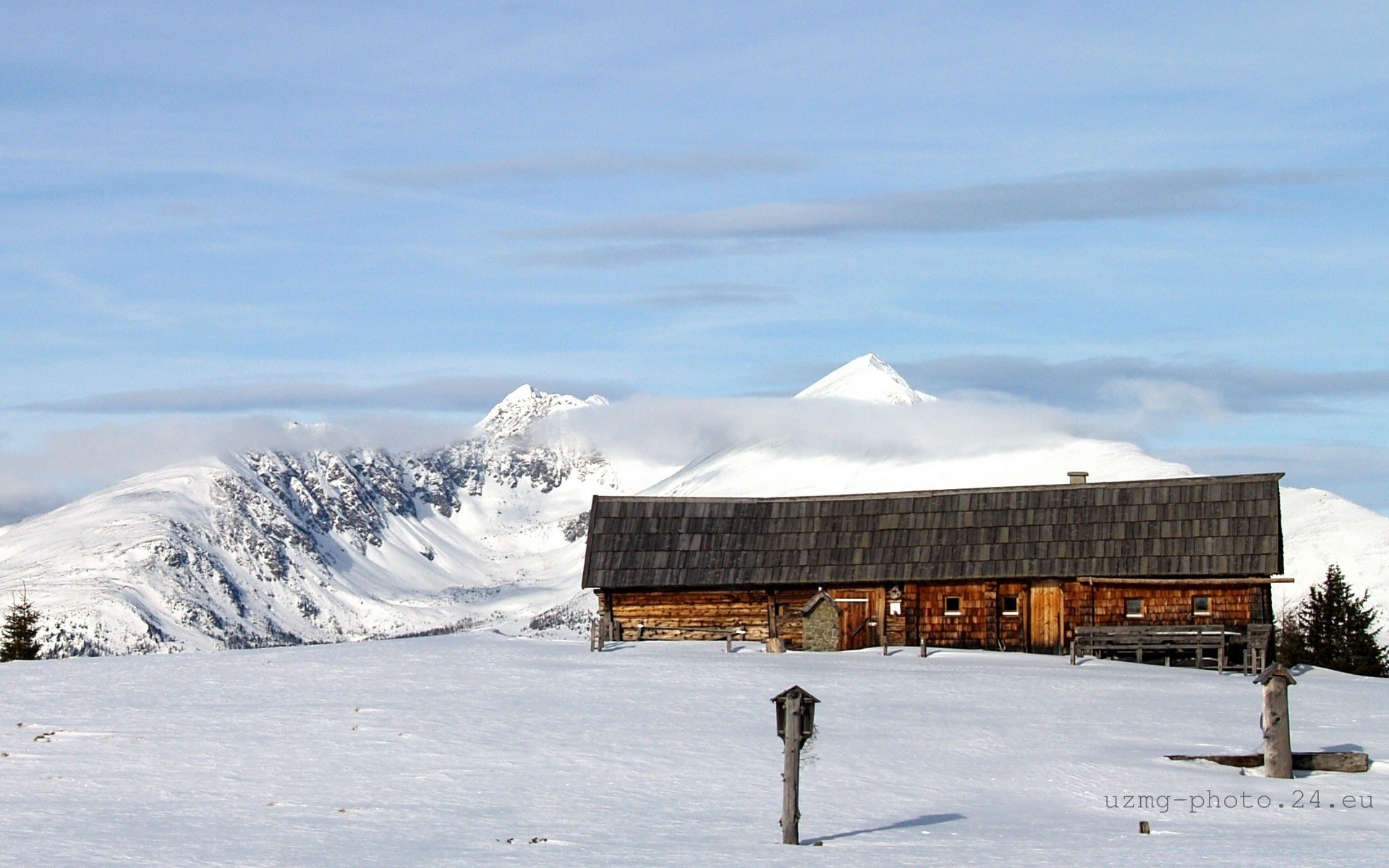 Die natürliche schönheit der schneebedeckten berge und wälderDie natürliche Schönheit der schneebedeckten Berge und Wälder