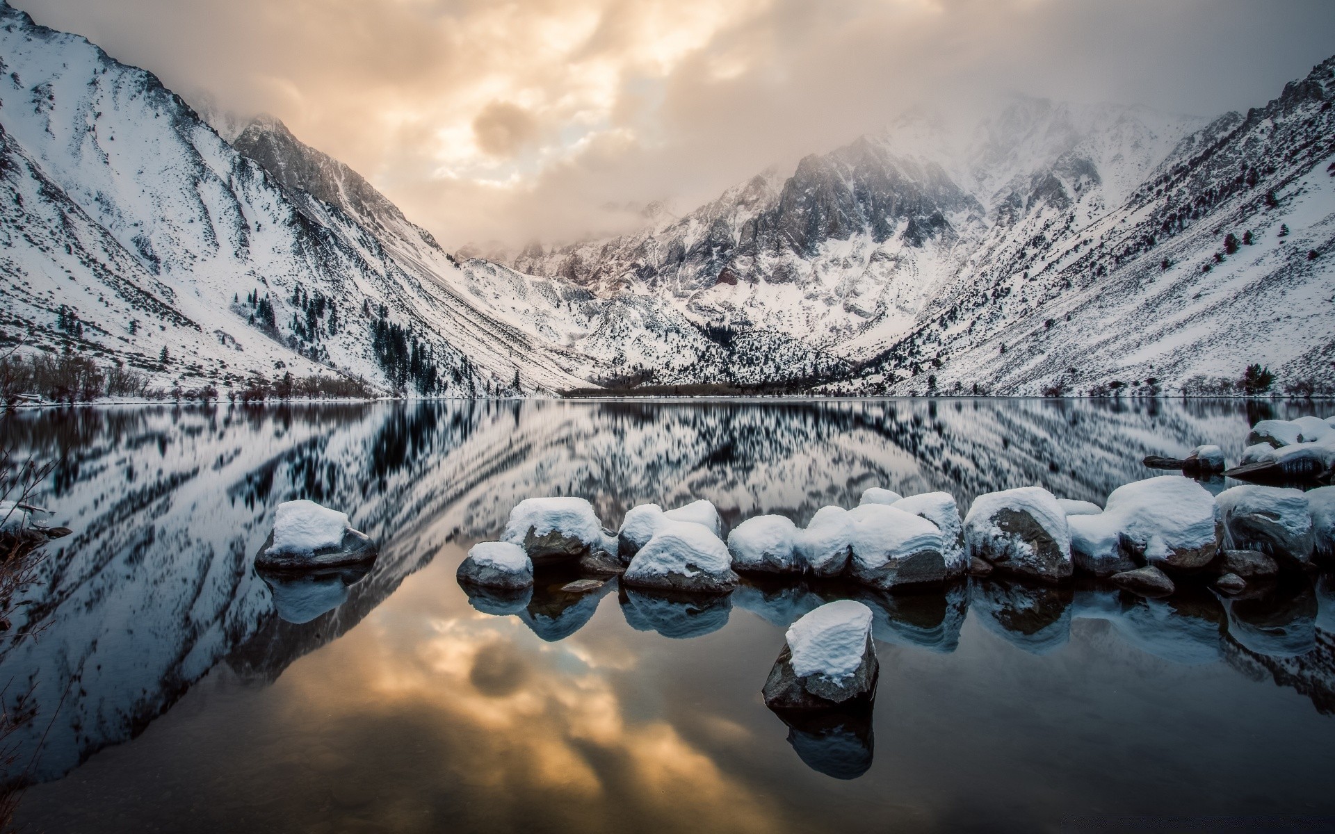 Schneebedeckte weiten inmitten der unebenheiten der bergeSchneebedeckte Weiten inmitten der Unebenheiten der Berge