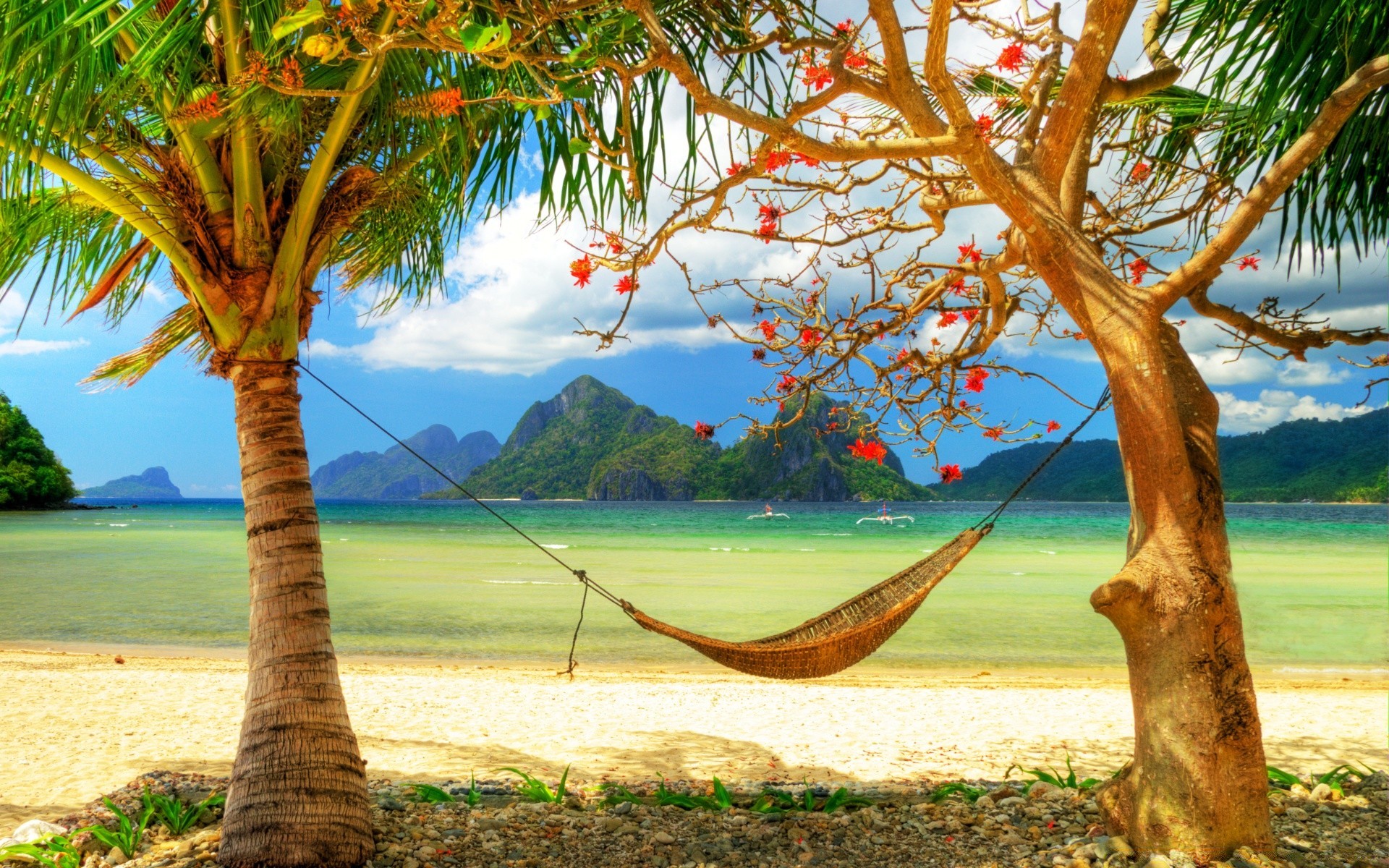 Hängematte zwischen zwei Palmen im Hintergrund der Berge