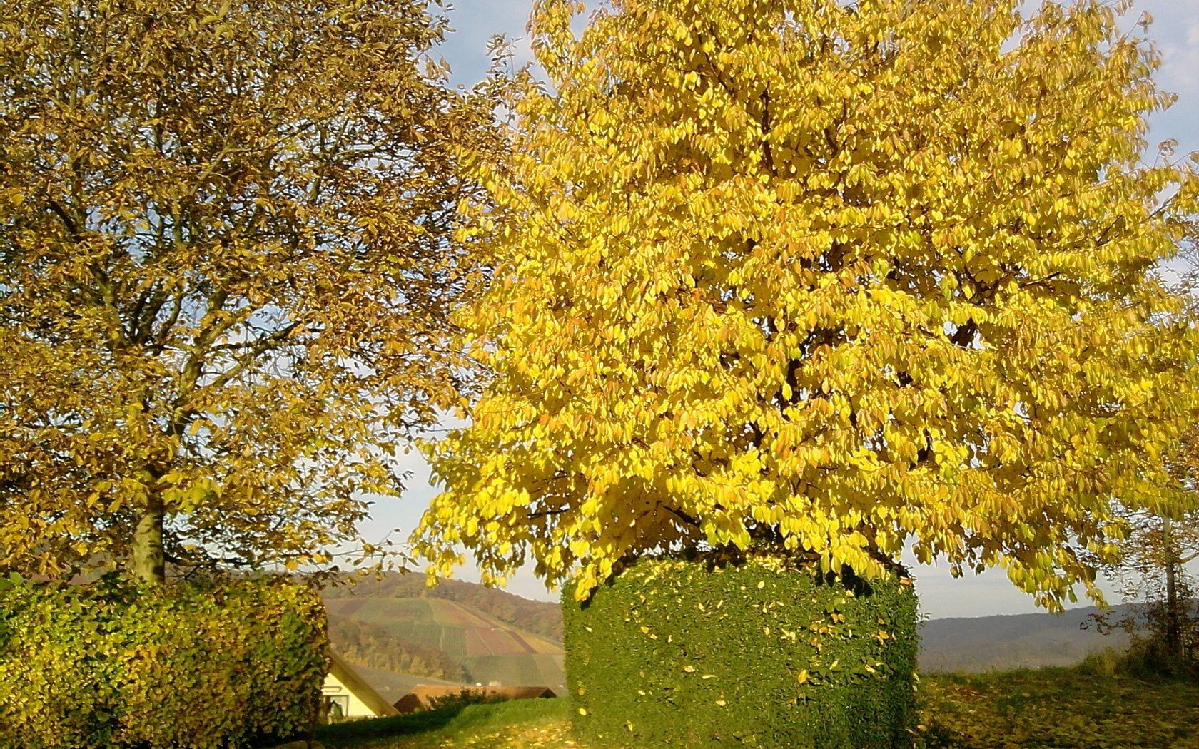 Herbst Himmel Sonne Sonnenuntergang Strahlen Berge Zweige Laub Meer