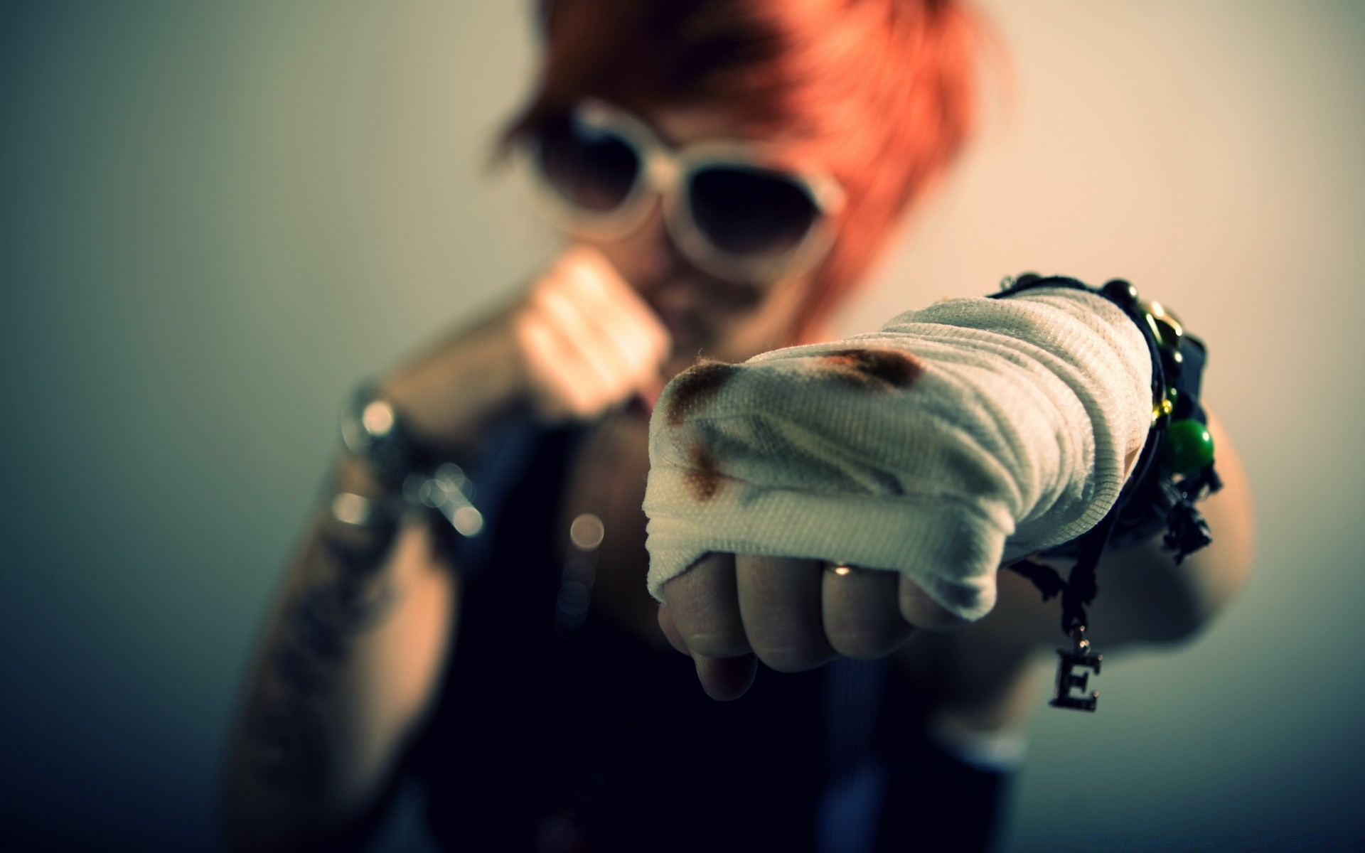 Kigboxen. mädchen mit sonnenbrille mit handverzerrter handKigboxen. Mädchen mit Sonnenbrille mit handverzerrter Hand