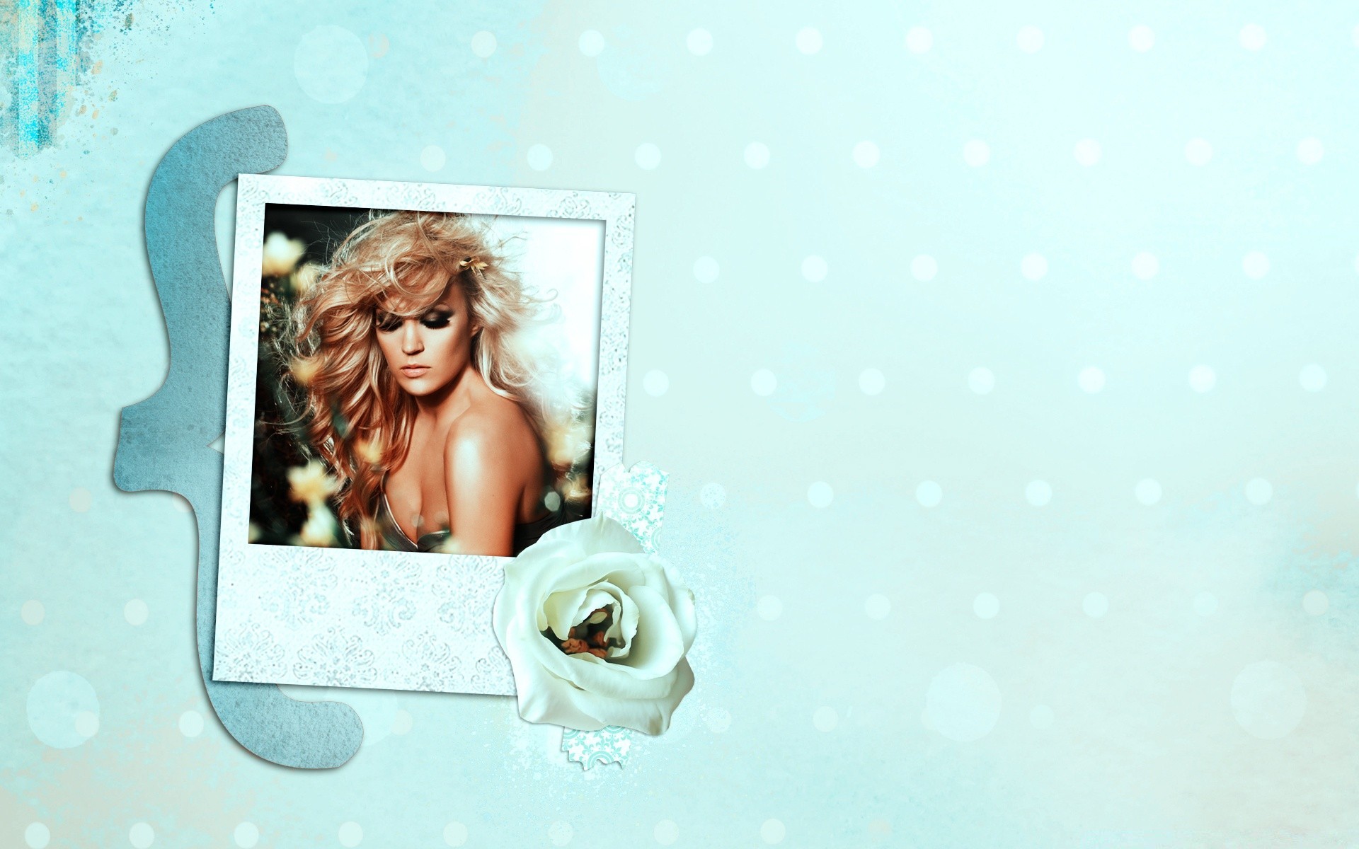 Polaroid-Foto einer erwachsenen blonden Frau. Foto einer Frau auf einem hellblauen Hintergrund