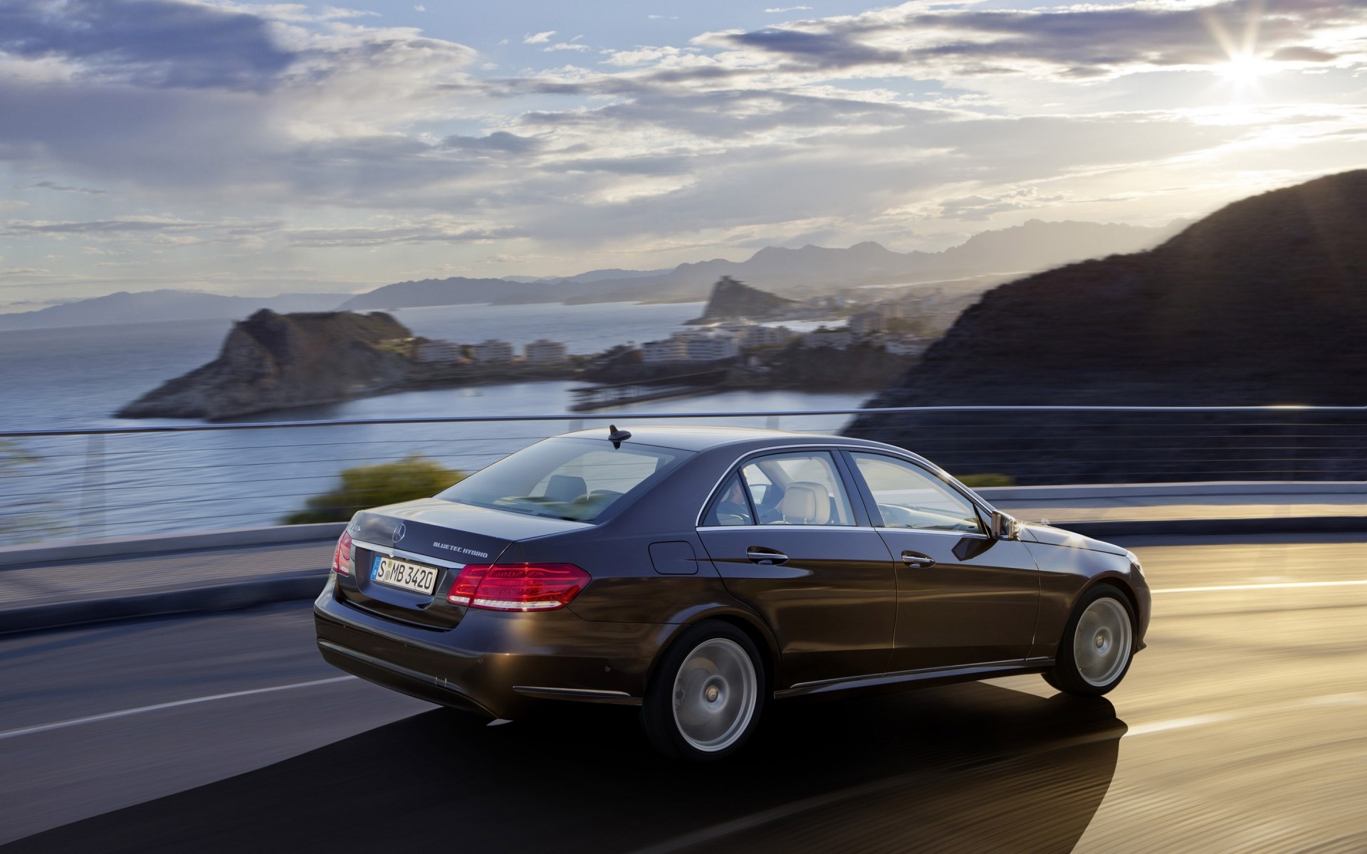 Mercedes Benz fährt entlang der Berge und des Wassers