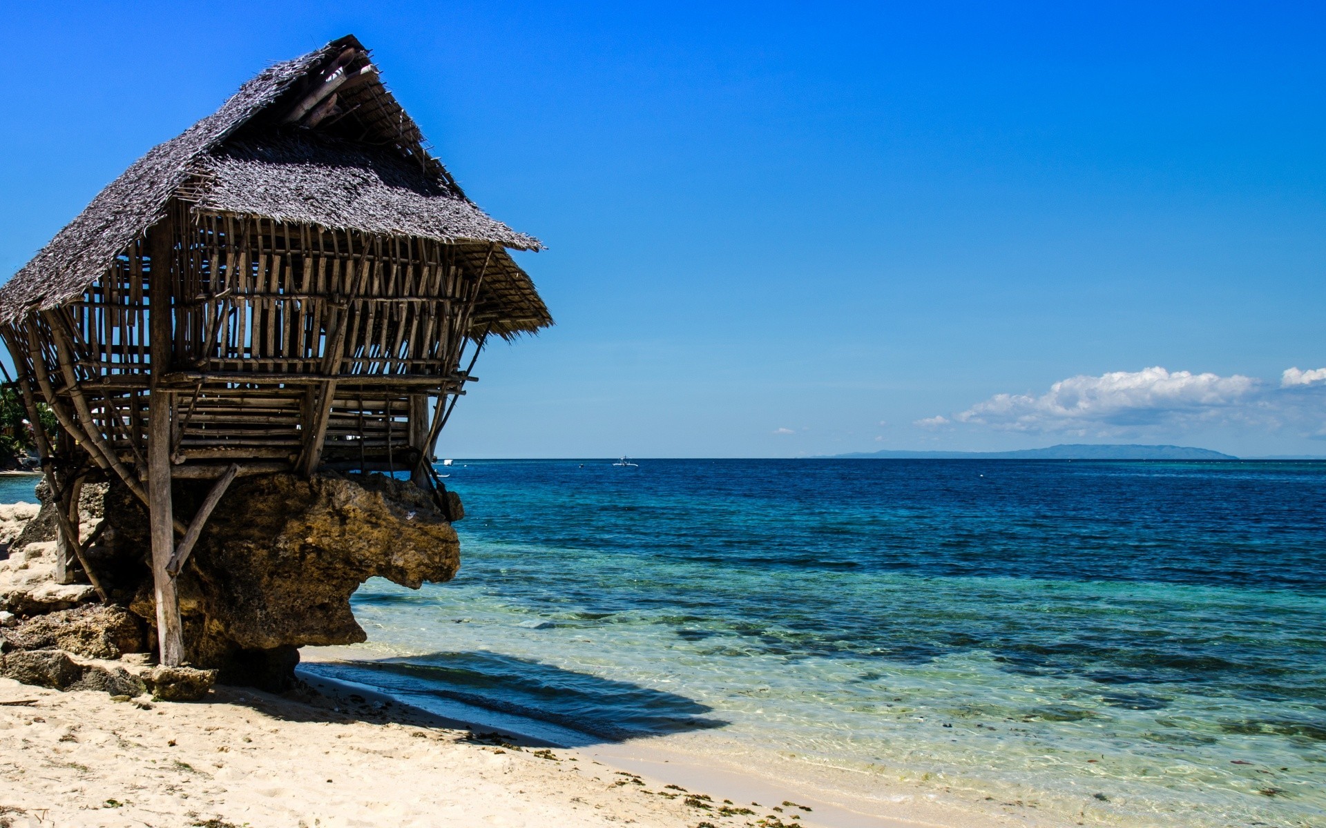 Alte Hütte vor dem Hintergrund des Ozeans und des tropischen Sandes