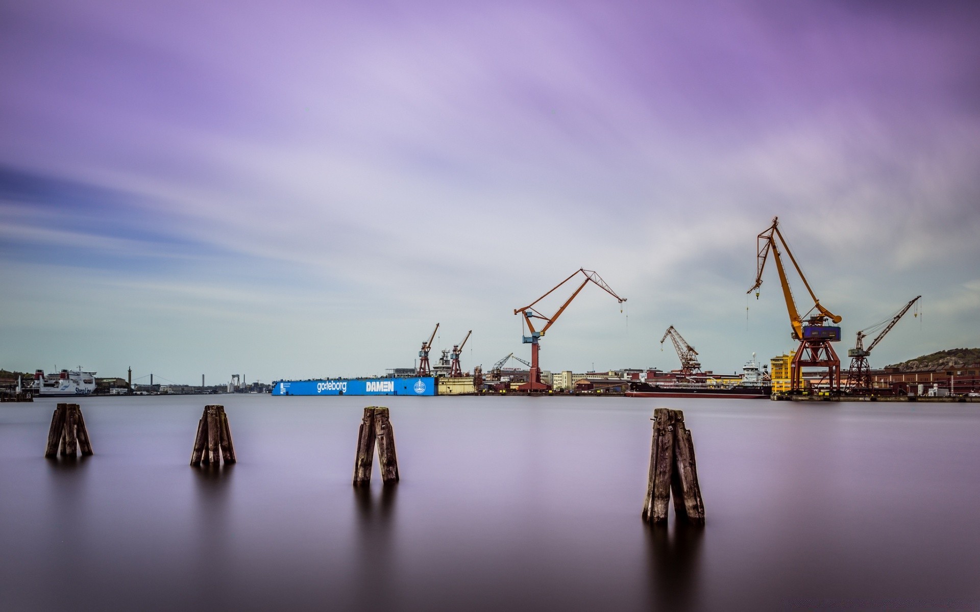 Industrielle Kräne und Frachtcontainer im Hafen vor dem Hintergrund des bewölkten Himmels und des ruhigen Meeres