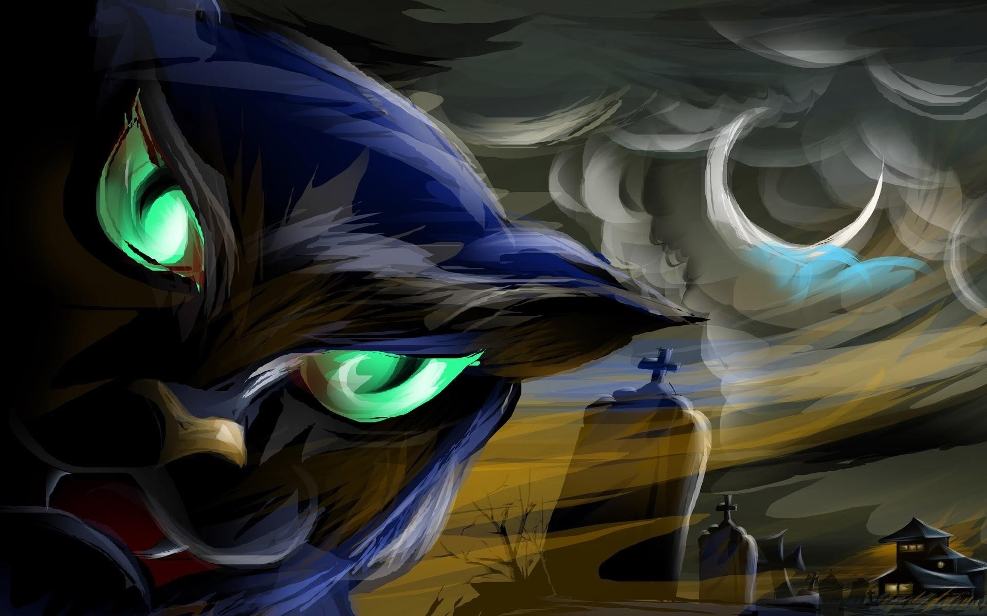 Das Bild einer Katze auf dem Hintergrund des Mondes und der Särge