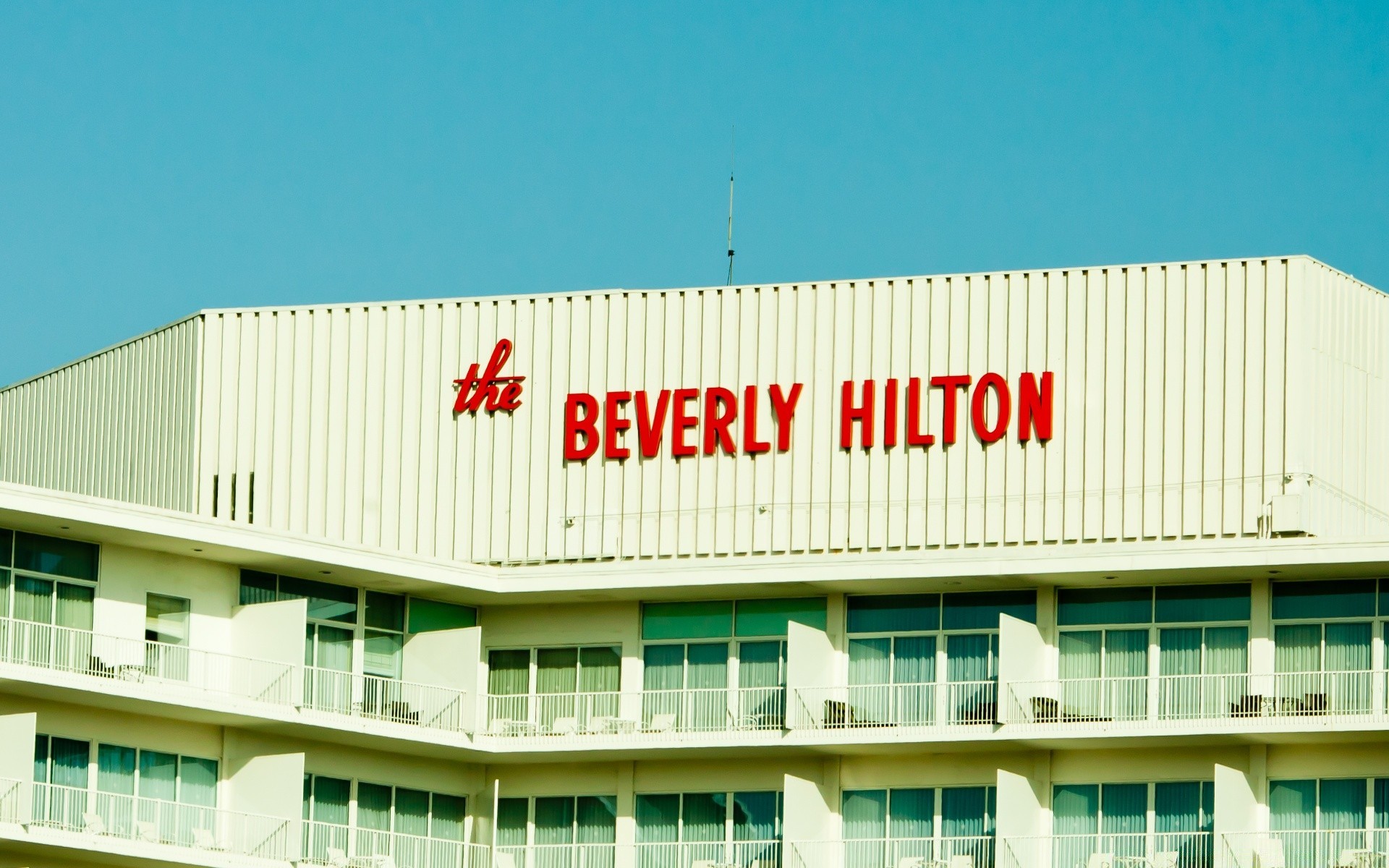 Schneeweißes Hotel vor dem Hintergrund des blauen Himmels