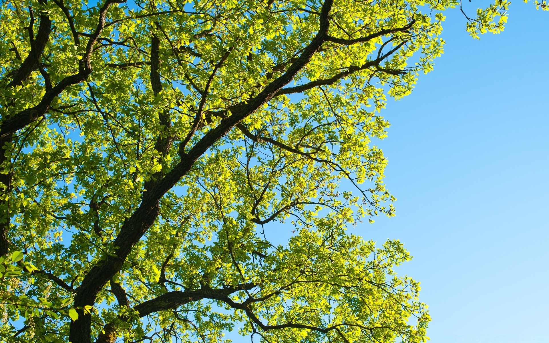 Zarte blühende Blätter vor dem Hintergrund des blauen Himmels
