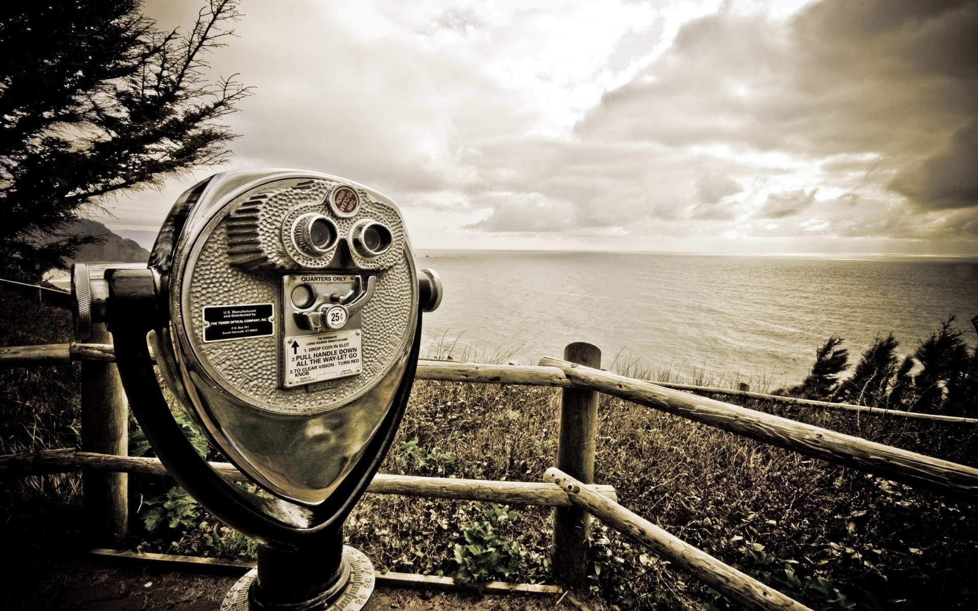 Monochromes foto des meeres mit einem fernglas am zaunMonochromes Foto des Meeres mit einem Fernglas am Zaun