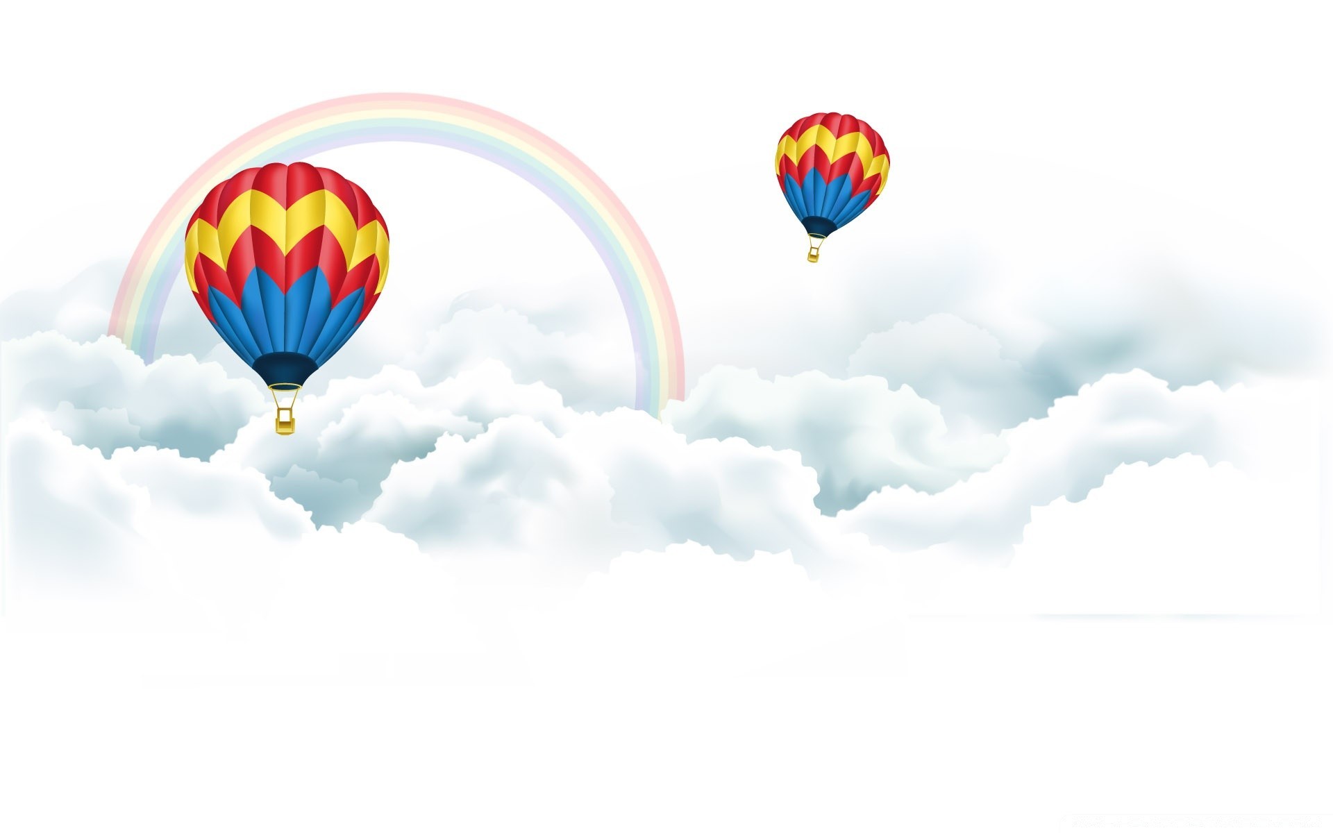 Ballons fliegen in Wolken mit Regenbogen
