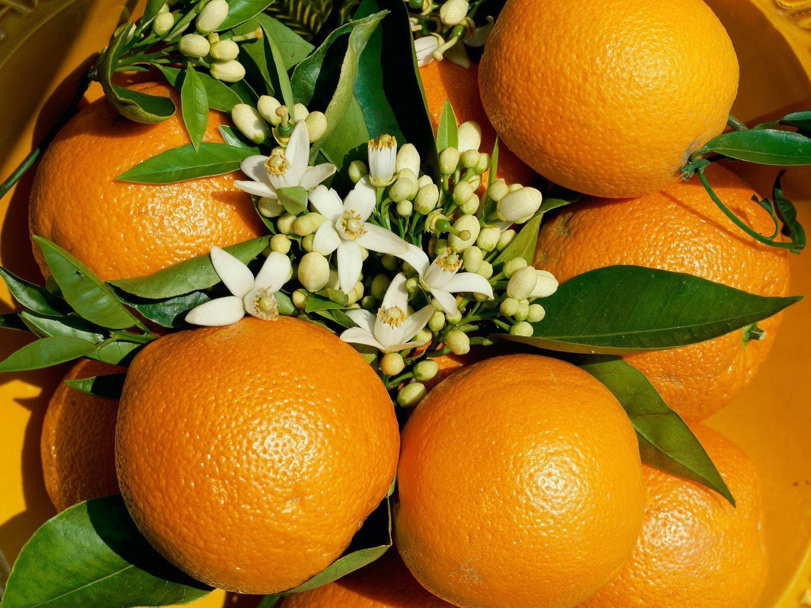 Saftige Mandarinen mit weißen Blüten