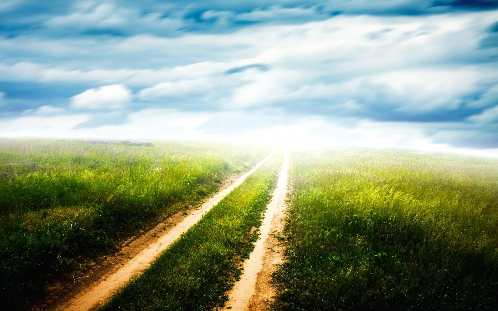 Blauer Himmel, blendende Sonne. Ein grünes Feld, das von der sengenden Sonne beleuchtet wird