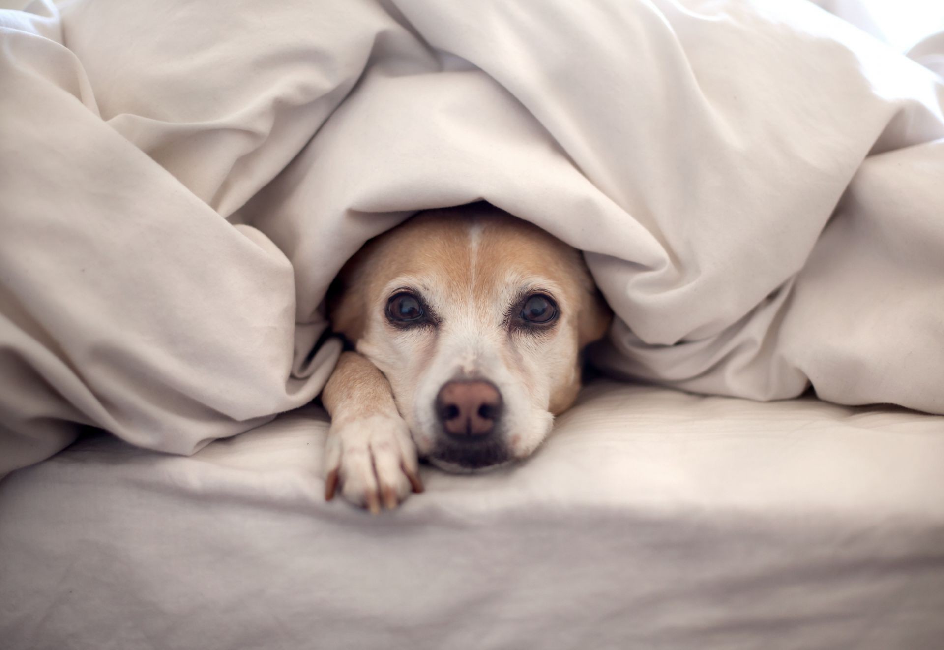 Der Hund wird geleckt, während er sich auf einem verankerten Hintergrund auf der Straße befindet