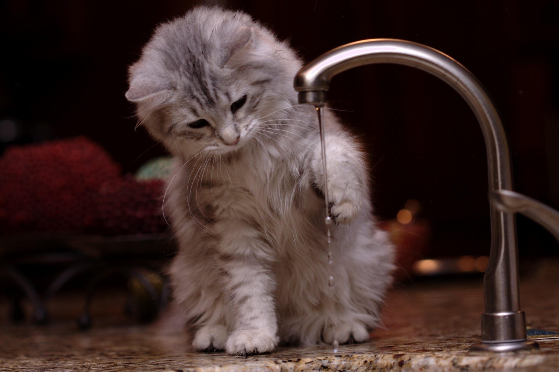 Ein graues Kätzchen, wie es von einem Rinnsal Wasser gespielt wird, das aus dem Wasserhahn läuft