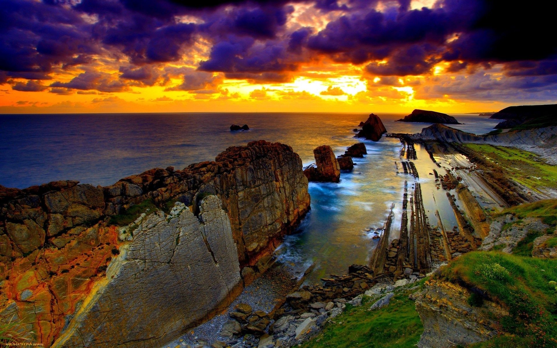 Auffallend helle Farben der Landschaft mit Felsen und Meer bei Sonnenuntergang