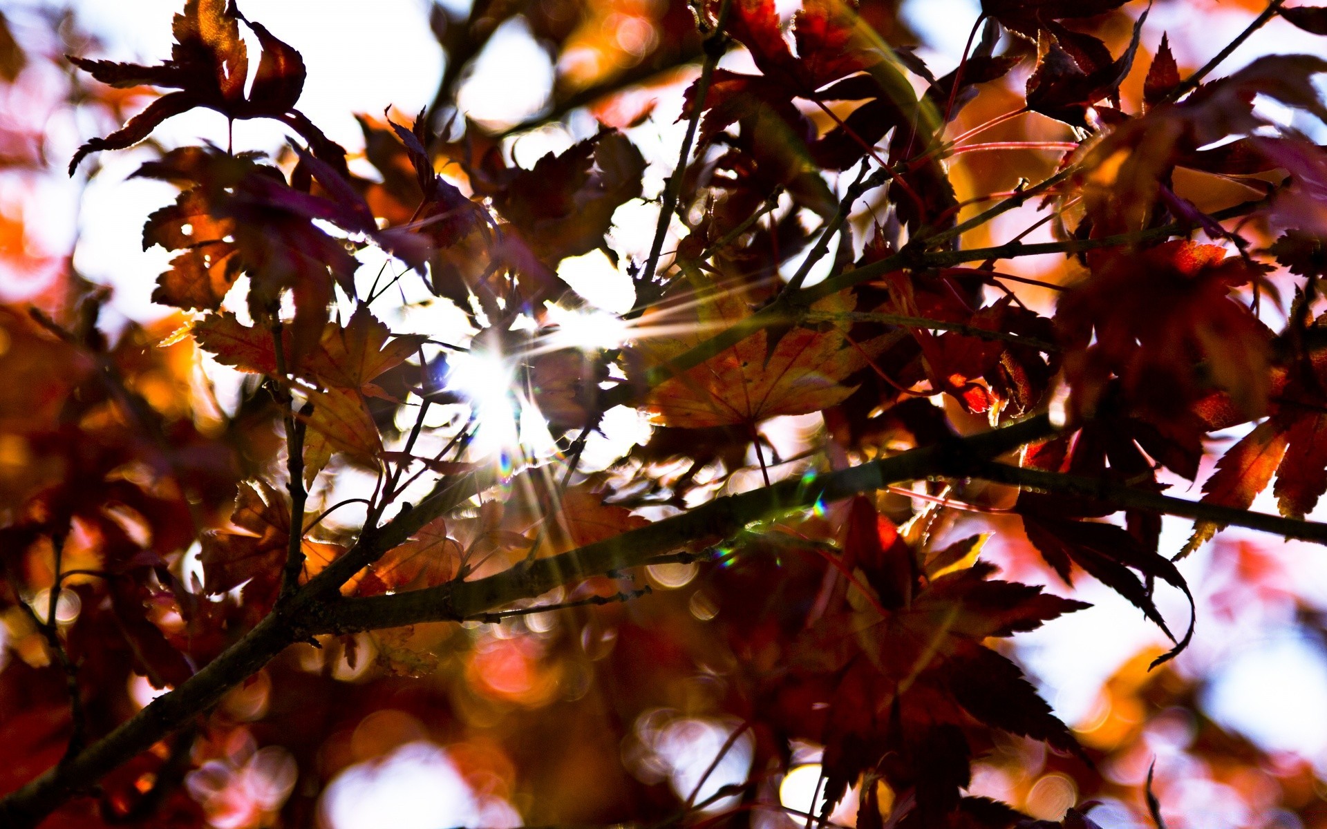 Die Sonnenstrahlen brechen durch die Äste von Bäumen mit Herbstlaub