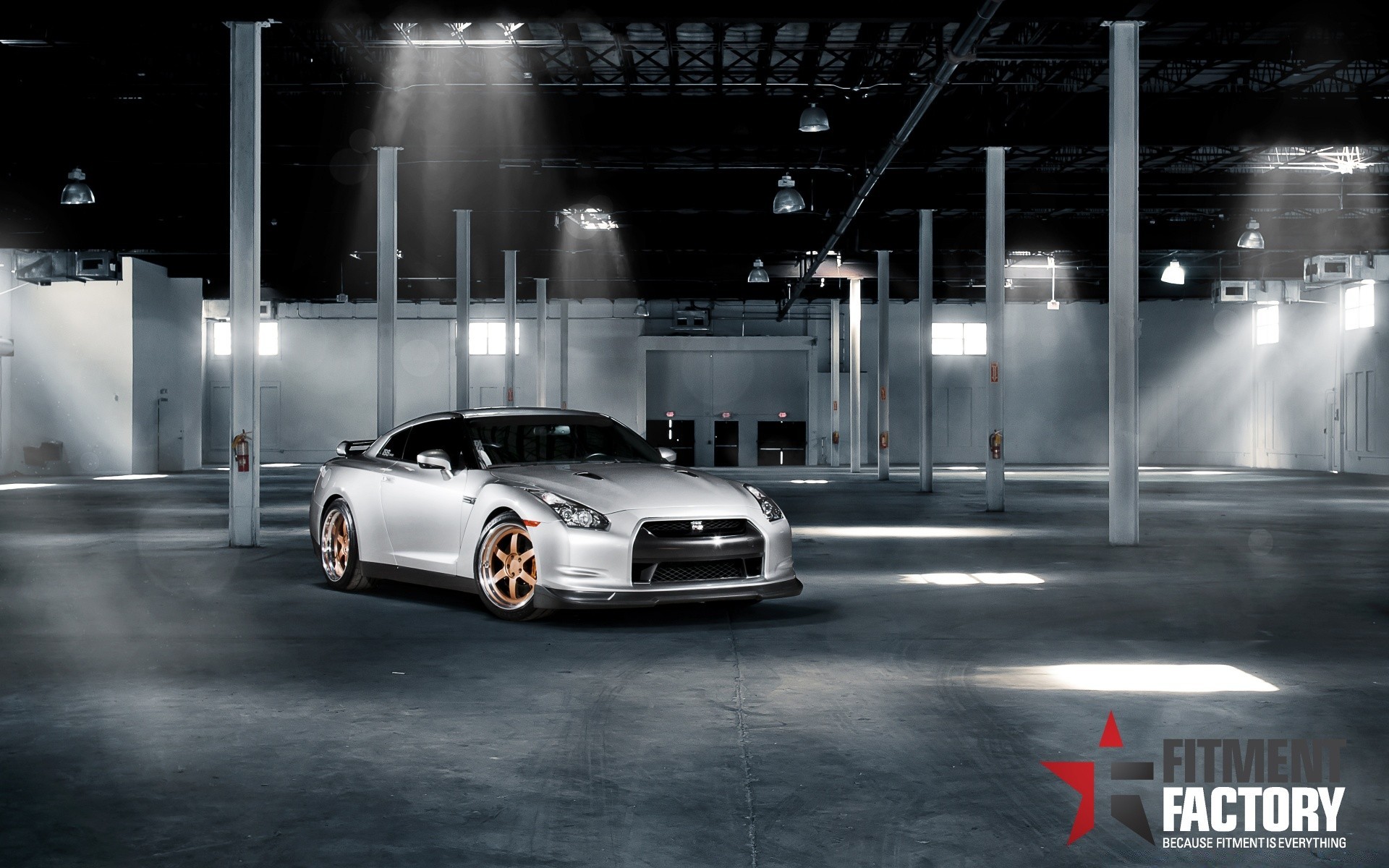 Grauer Sportwagen in einem leeren Hangar